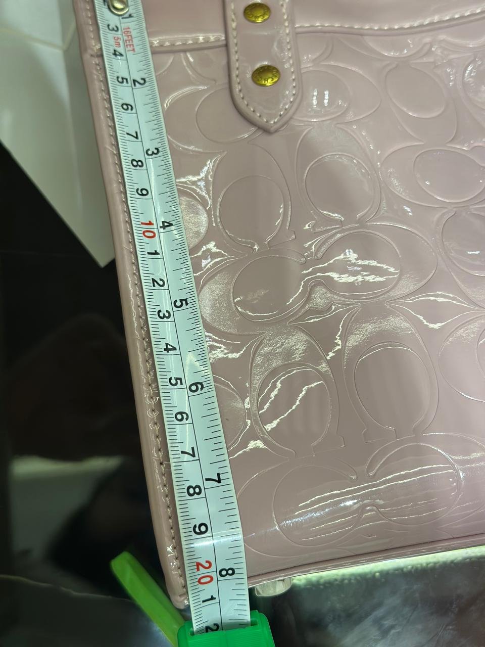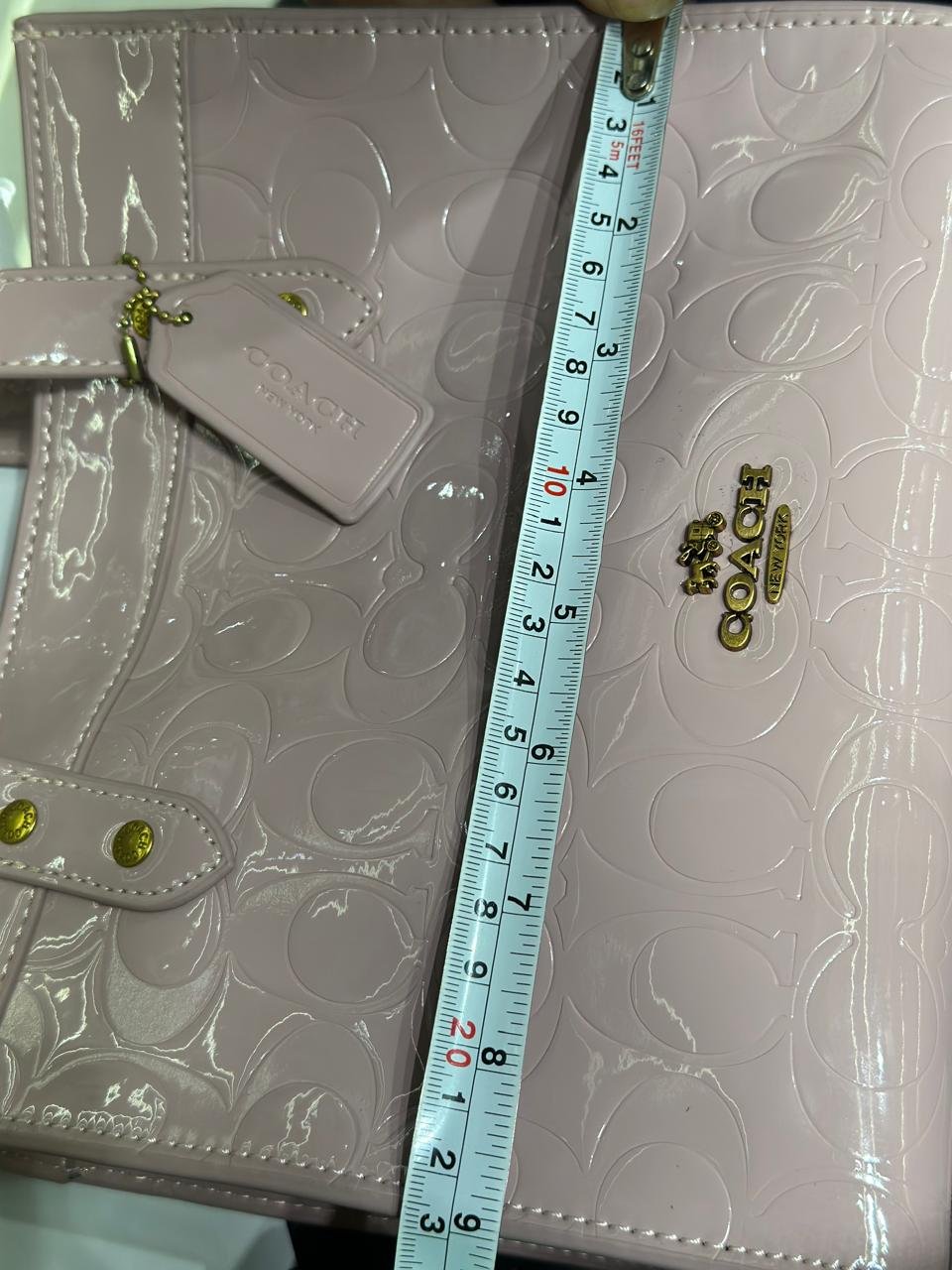 A bold yet elegant statement piece, this Coach mini tote bag is crafted from glossy patent leather embossed with the iconic Signature “C” pattern. Finished with rich gold-tone hardware and a playful cherry charm, it blends classic Coach heritage with modern feminine flair.