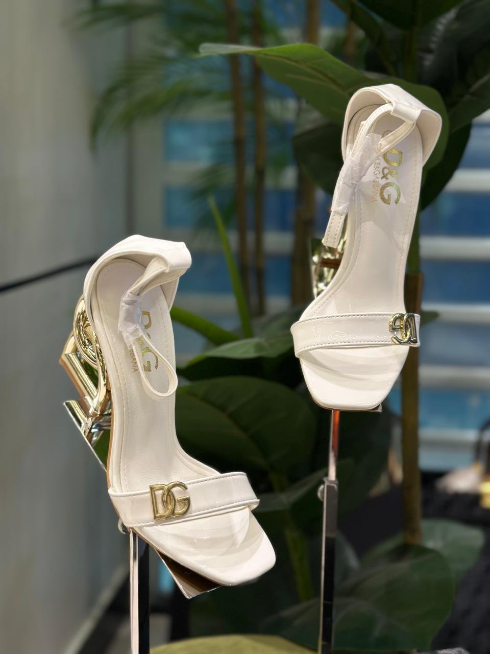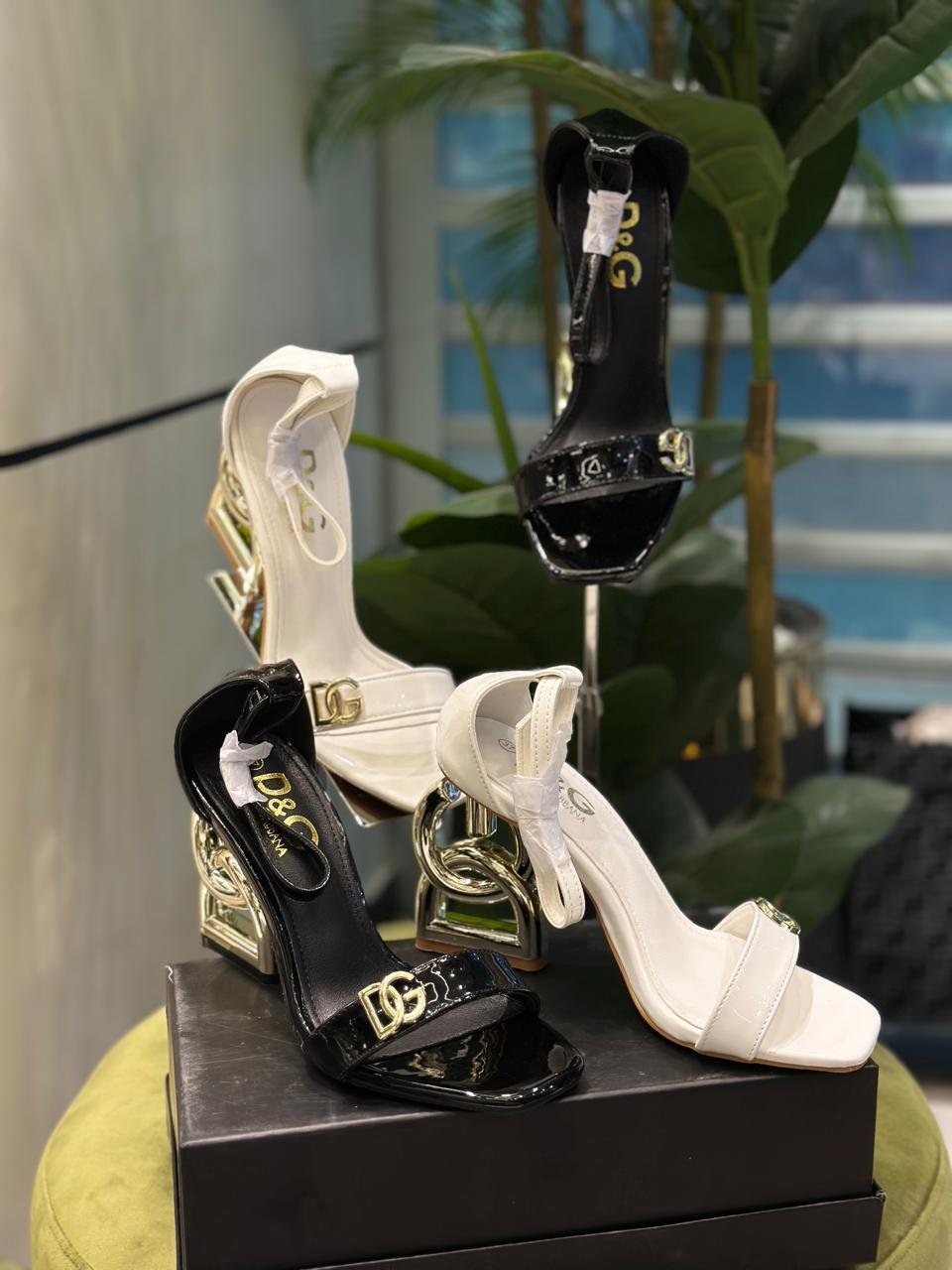 Bold, glamorous, and unmistakably luxe, these Dolce & Gabbana high-heel sandals are designed to make a statement. Crafted in glossy black patent leather, the pair features the iconic DG logo strap and a striking sculptural gold-tone heel, blending elegance with high-fashion drama—perfect for evening wear, parties, and special occasions.