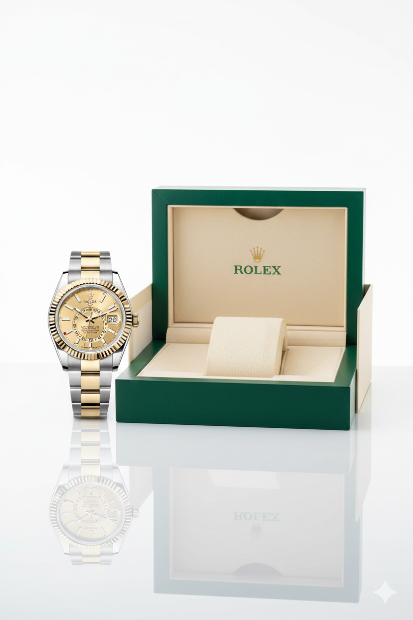 The Rolex Sky-Dweller in yellow gold and Oystersteel is a sophisticated travel watch designed for modern men who value precision, prestige, and functionality. Featuring a refined champagne dial and Rolex’s iconic fluted bezel, this timepiece is engineered for global lifestyles with effortless elegance.